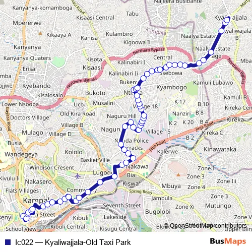 See why over 2 million users trust and consider busmaps.com as the best public transport website. busmaps gives you Kampala Buses suggested routes, real-time bus tracker, line route maps in Kampala, and helps to find the closest Ic022 bus stops near you. No internet available? Download an offline PDF map and bus schedule for the Ic022 bus to take on your trip.