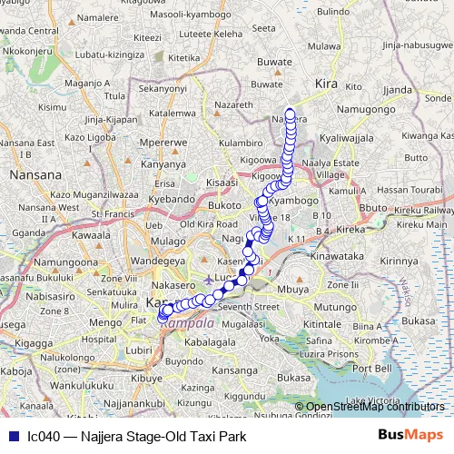 The first stop of the Ic040 bus route is Old Taxi Park (Burton Street) and the last stop is Tosha Petrol Station (Najeera). Ic040 (Najjera Stage-Old Taxi Park) is operational during everyday.