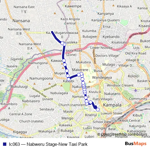 The first stop of the Ic063 bus route is New Taxi Park and the last stop is Kazo Church of Uganda. Ic063 (Nabweru Stage-New Taxi Park) is operational during everyday.