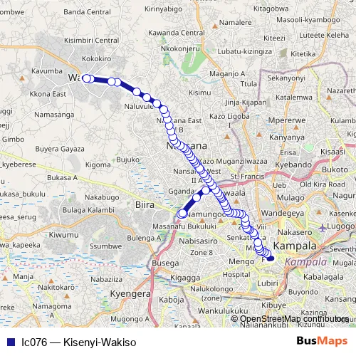 The first stop of the Ic076 bus route is Kobil Bakuli Stage and the last stop is Kobil Petro Station (Wakiso). Ic076 (Kisenyi-Wakiso) is operational during everyday.
