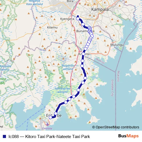 The first stop of the Ic088 bus route is Mutundwe (Wabiyinja) and the last stop is Kitoro Taxi Park - Entebbe. Ic088 (Kitoro Taxi Park-Nateete Taxi Park) is operational during everyday.