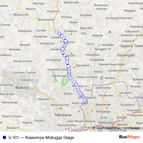 The first stop of the Ic101 bus route is Kawempe Stage and the last stop is Matugga Stage. Ic101 (Kawempe-Matugga Stage) is operational during everyday.
