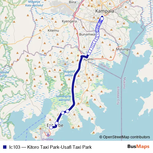 The first stop of the Ic103 bus route is Kitoro Taxi Park - Entebbe and the last stop is Gapco Totalpetro Station (Katwe). Ic103 (Kitoro Taxi Park-Usafi Taxi Park) is operational during everyday.