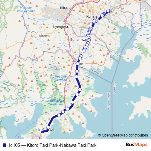 The first stop of the Ic105 bus route is Nakawa Taxi and the last stop is Entebbe Town. Ic105 (Kitoro Taxi Park-Nakawa Taxi Park) is operational during everyday.