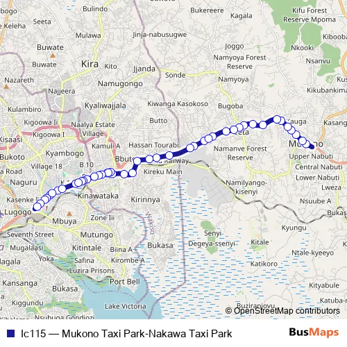 The first stop of the Ic115 bus route is Mukono Health Centre and the last stop is Utoda Nakawa. Ic115 (Mukono Taxi Park-Nakawa Taxi Park) is operational during everyday.