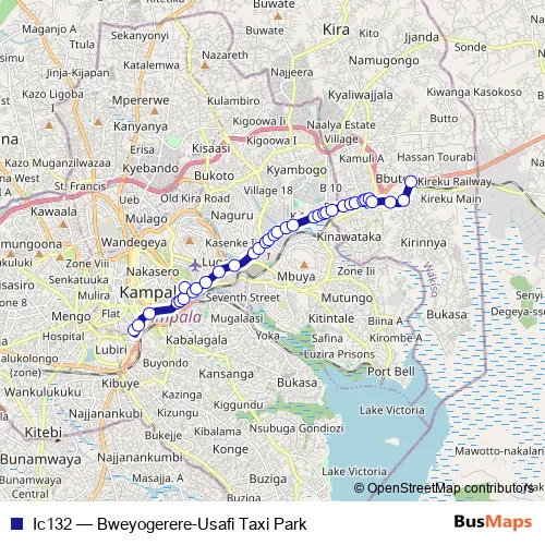 The first stop of the Ic132 bus route is Usafi Taxi Park and the last stop is Bweyogerere. Ic132 (Bweyogerere-Usafi Taxi Park) is operational during everyday.