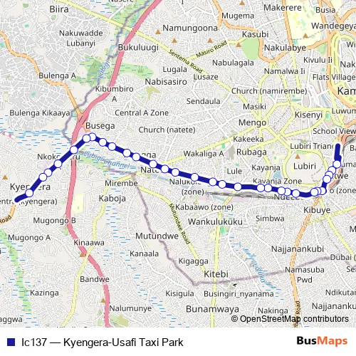 The first stop of the Ic137 bus route is Gapco Totalpetro Station (Katwe) and the last stop is Kyengera Taxi Park. Ic137 (Kyengera-Usafi Taxi Park) is operational during everyday.