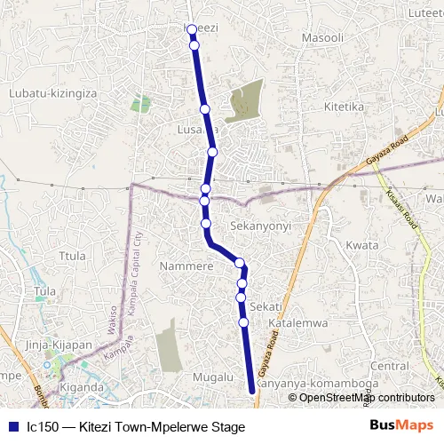 The first stop of the Ic150 bus route is Kitezi Town and the last stop is Sir Petroleum Mpererwe. Ic150 (Kitezi Town-Mpelerwe Stage) is operational during everyday.