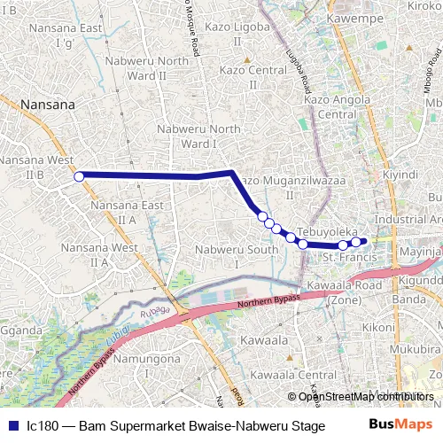 The first stop of the Ic180 bus route is Eden Service Park and the last stop is Nabweru. Ic180 (Bam Supermarket Bwaise-Nabweru Stage) is operational during everyday.