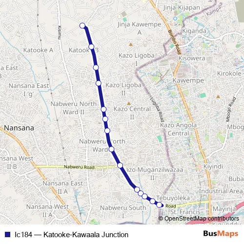 The first stop of the Ic184 bus route is Katooke Stage and the last stop is Kawaala Junction. Ic184 (Katooke-Kawaala Junction) is operational during everyday.