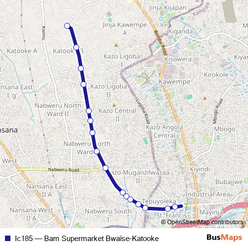 The first stop of the Ic185 bus route is Katooke Stage and the last stop is Eden Service Park. Ic185 (Bam Supermarket Bwaise-Katooke) is operational during everyday.