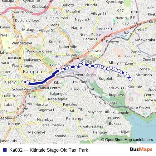 The first stop of the Ka032 bus route is Kitintale Stage and the last stop is Old Taxi Park (Market Street). Ka032 (Kitintale Stage-Old Taxi Park) is operational during everyday.