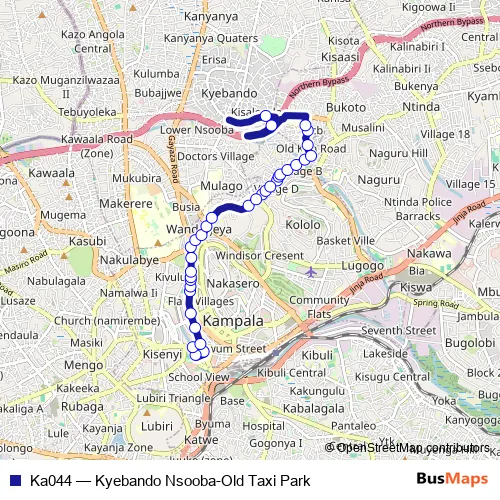 The first stop of the Ka044 bus route is Kampala Old Taxi Park and the last stop is Kyebando Kisalosalo. Ka044 (Kyebando Nsooba-Old Taxi Park) is operational during everyday.