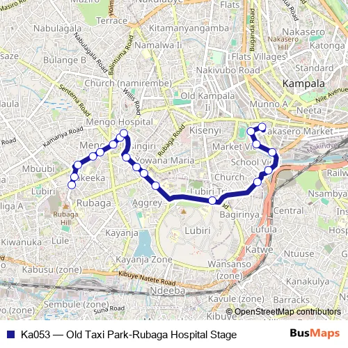 The first stop of the Ka053 bus route is Lubaga Hospital and the last stop is Kampala Old Taxi Park. Ka053 (Old Taxi Park-Rubaga Hospital Stage) is operational during everyday.