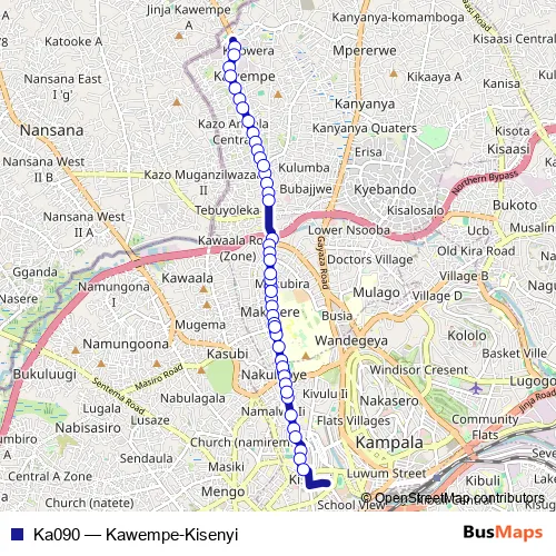 The first stop of the Ka090 bus route is Benzina Petrol Station (Kawempe) and the last stop is Kobil Bakuli Stage. Ka090 (Kawempe-Kisenyi) is operational during everyday.
