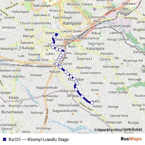 The first stop of the Ka101 bus route is Luwafu Stage and the last stop is Dahabismil Forex Bureau (Kisenyi). Ka101 (Kisenyi-Luwafu Stage) is operational during everyday.