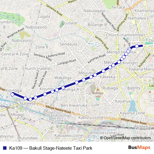 The first stop of the Ka109 bus route is Victorious Primary School (Bakuli) and the last stop is Nateete Taxi Park. Ka109 (Bakuli Stage-Nateete Taxi Park) is operational during everyday.