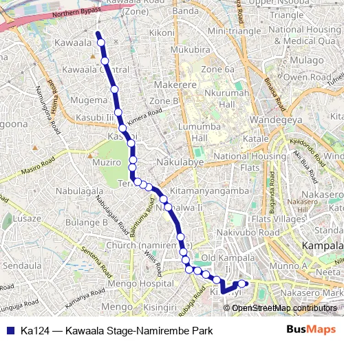 The first stop of the Ka124 bus route is Namirembe Park and the last stop is Kawala. Ka124 (Kawaala Stage-Namirembe Park) is operational during everyday.