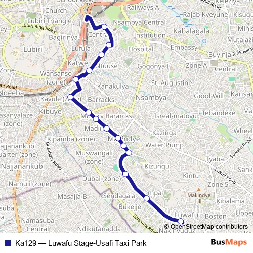 The first stop of the Ka129 bus route is Luwafu Stage and the last stop is St. Paul's Sub-parish. Ka129 (Luwafu Stage-Usafi Taxi Park) is operational during everyday.