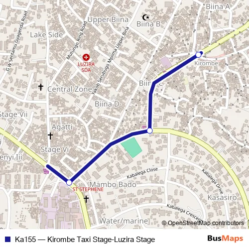 The first stop of the Ka155 bus route is Luzira Stage and the last stop is Kirombe Taxi Stage. Ka155 (Kirombe Taxi Stage-Luzira Stage) is operational during everyday.