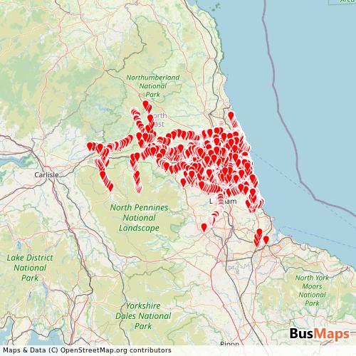 Go North East operates in the following cities: Gateshead, Newcastle upon Tyne, Wallsend, Sunderland, Pelton, South Shields, Lamesley, Durham, Consett, Easington Colliery, Horsley, Muggleswick, Shotton, West Rainton, Acomb, Bardon Mill, Birtley, Dinnington, Murton, Stanley, Allendale Town, Cramlington, Greenhead, Hartlepool, Hexham, Seaham, Slaley, Stockton-on-Tees, Warden.