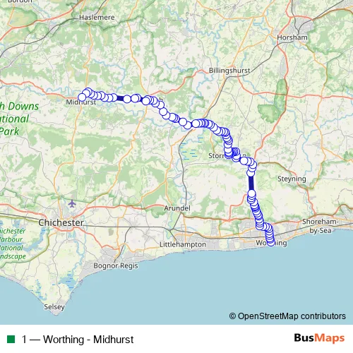 The first stop of the 1 bus route is South Street and the last stop is Bus Station. 1 (Worthing - Midhurst) is operational during everyday.