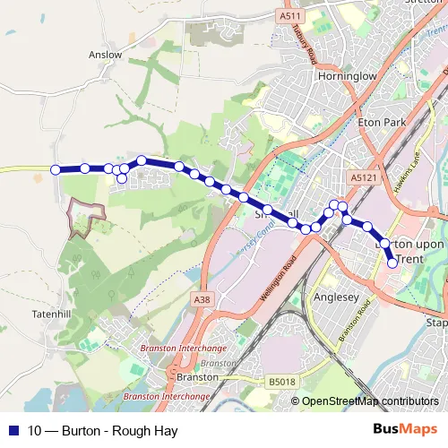 The first stop of the 10 bus route is Acorn Inn and the last stop is New Street. 10 (Burton - Rough Hay) is operational during everyday.