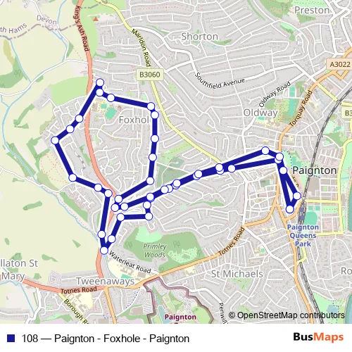 The first stop of the 108 bus route is Bus Station and the last stop is Bus Station. 108 (Paignton - Foxhole - Paignton) is operational during everyday.