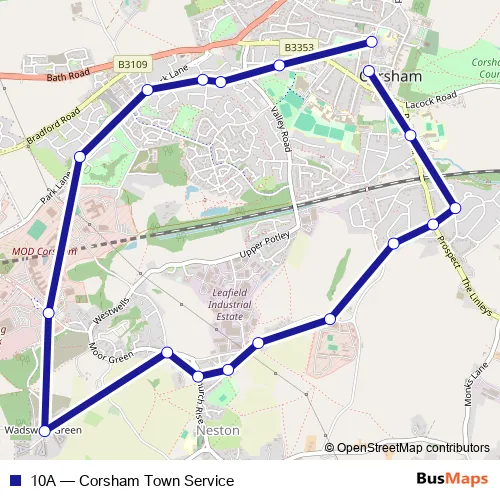 The first stop of the 10A bus route is Newlands Road Co-Op and the last stop is Newlands Road. 10A (Corsham Town Service) is operational during everyday.