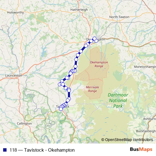 The first stop of the 118 bus route is Railway Station and the last stop is Bus Station. 118 (Tavistock - Okehampton) is operational during everyday.