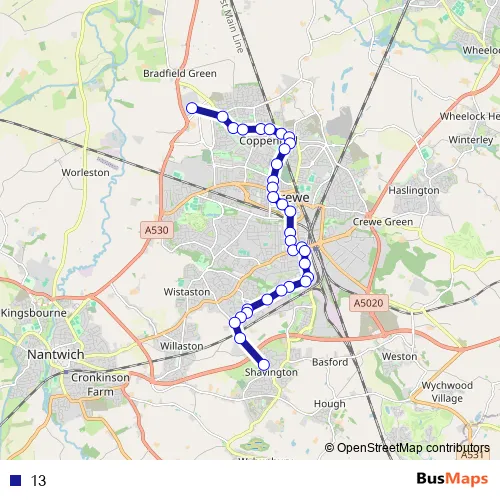The first stop of the 13 bus route is Leighton Hospital and the last stop is The Vine. 13 is operational during on weekdays.