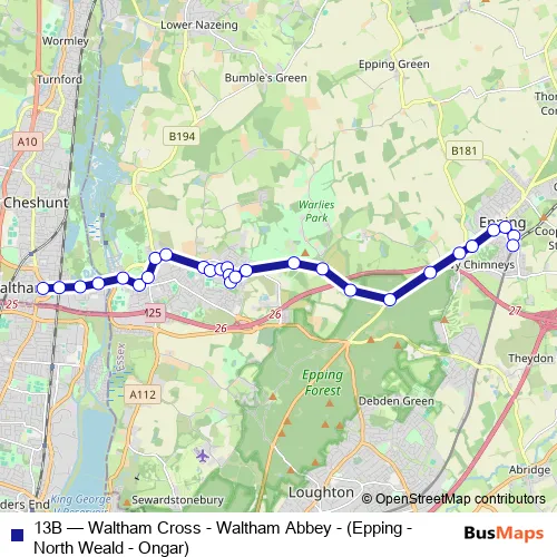The first stop of the 13B bus route is Bus Station and the last stop is Railway Station. 13B (Waltham Cross - Waltham Abbey - (Epping - North Weald - Ongar)) is operational during everyday.