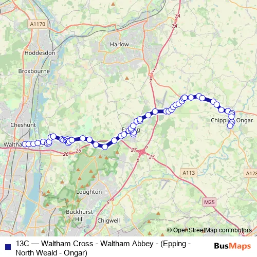 Click here to view the nearest 13C - Waltham Cross - Waltham Abbey - (Epping - North Weald - Ongar) bus stop.