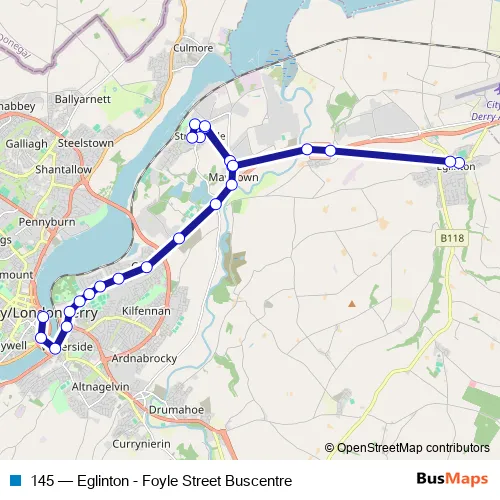 The first stop of the 145 bus route is Main Street and the last stop is Foyle Street Bus Station. 145 (Eglinton - Foyle Street Buscentre) is operational during everyday.