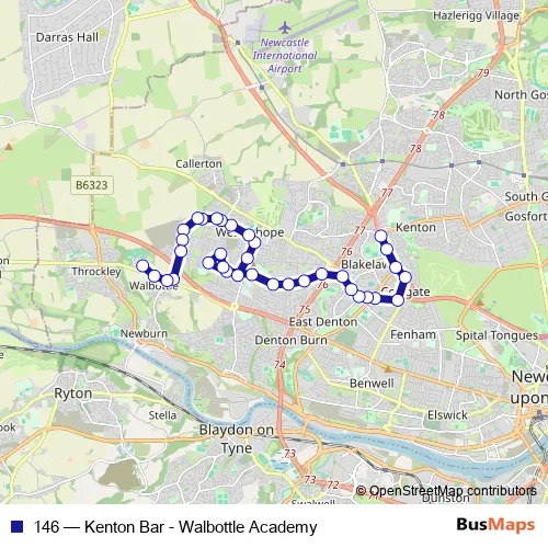 The first stop of the 146 bus route is Ponteland Road - Kenton Lane and the last stop is Walbottle Academy. 146 (Kenton Bar - Walbottle Academy) is operational during on weekdays.