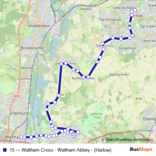 The first stop of the 15 bus route is Temp Bus Station and the last stop is Bus Station. 15 (Waltham Cross - Waltham Abbey - (Harlow)) is operational during everyday.