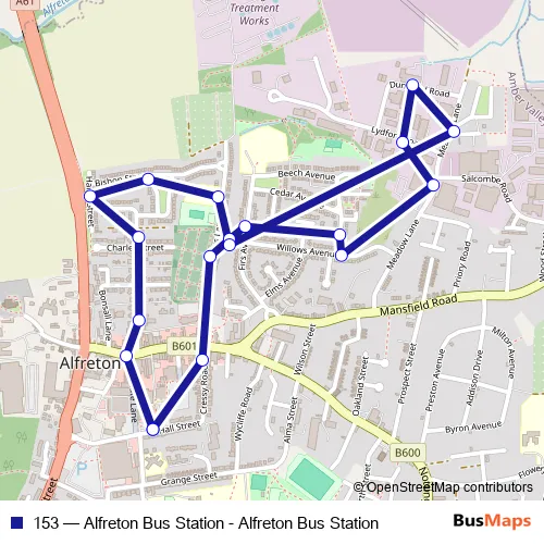 The first stop of the 153 bus route is Alfreton Bus Station and the last stop is Alfreton Bus Station. 153 (Alfreton Bus Station - Alfreton Bus Station) is operational during everyday.