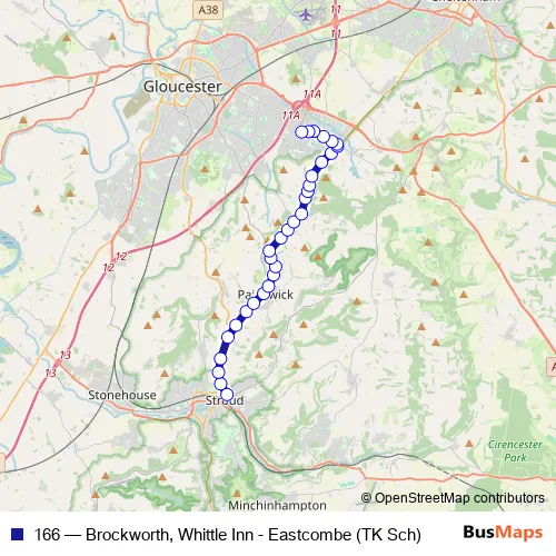 The first stop of the 166 bus route is Merrywalks and the last stop is Whittle Inn. 166 (Brockworth, Whittle Inn - Eastcombe (TK Sch)) is operational during everyday.