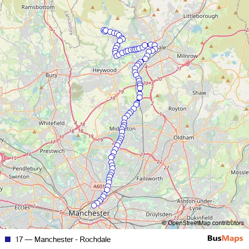 See why over 2 million users trust and consider busmaps.com as the best public transport website. busmaps gives you Rochdale Buses suggested routes, real-time bus tracker, line route maps in Rochdale, and helps to find the closest 17 bus stops near you. No internet available? Download an offline PDF map and bus schedule for the 17 bus to take on your trip.