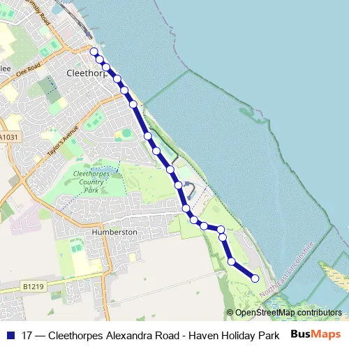 The first stop of the 17 bus route is Recreational Centre and the last stop is Alexandra Road. 17 (Cleethorpes Alexandra Road - Haven Holiday Park) is operational during everyday.