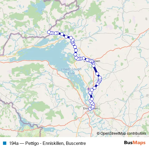The first stop of the 194a bus route is Enniskillen Bus Station and the last stop is Pettigo HM Customs. 194a (Pettigo - Enniskillen, Buscentre) is operational during on weekdays.