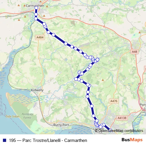 The first stop of the 195 bus route is Parc Trostre and the last stop is Carmarthen Bus Station Stand 2. 195 (Parc Trostre/Llanelli - Carmarthen) is operational during everyday.
