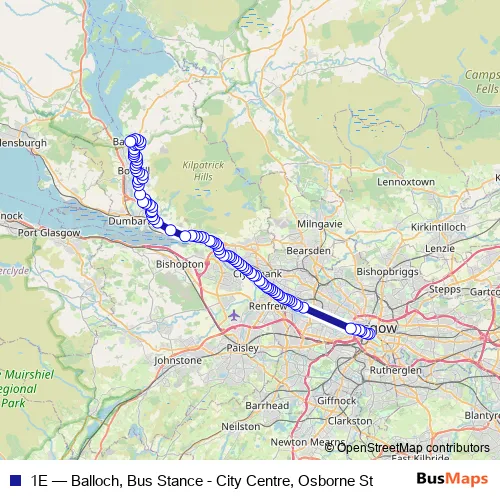 The first stop of the 1E bus route is Osborne Street and the last stop is Balloch Bus Terminus. 1E (Balloch, Bus Stance - City Centre, Osborne St) is operational during on weekdays.