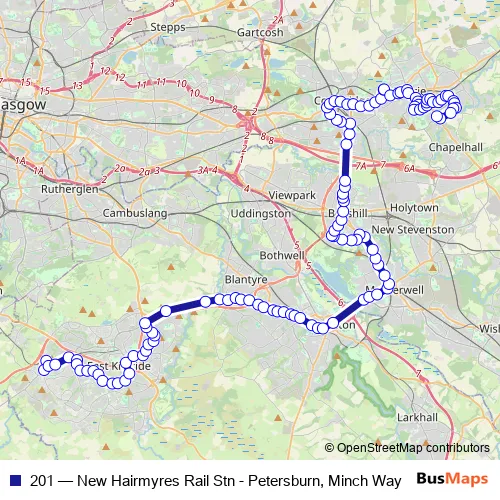 The first stop of the 201 bus route is Hairmyres Rail Station and the last stop is Turning Circle. 201 (New Hairmyres Rail Stn - Petersburn, Minch Way) is operational during everyday.