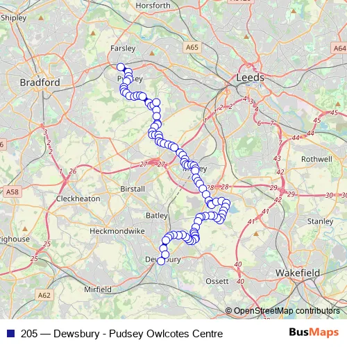 Bus 205 - Dewsbury - Pudsey Owlcotes Centre: Full Schedule in Morley