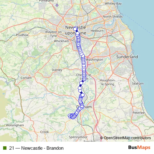 The first stop of the 21 bus route is Bus Turning Circle and the last stop is Eldon Square Bus Station. 21 (Newcastle - Brandon) is operational during everyday.