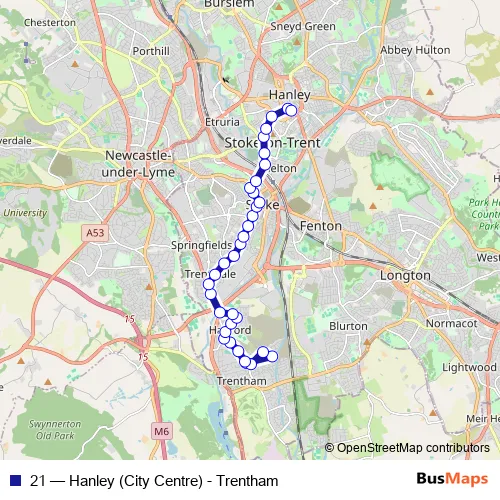 See why over 2 million users trust and consider busmaps.com as the best public transport website. busmaps gives you Stoke-on-Trent Buses suggested routes, real-time bus tracker, line route maps in Stoke-on-Trent, and helps to find the closest 21 bus stops near you. No internet available? Download an offline PDF map and bus schedule for the 21 bus to take on your trip.