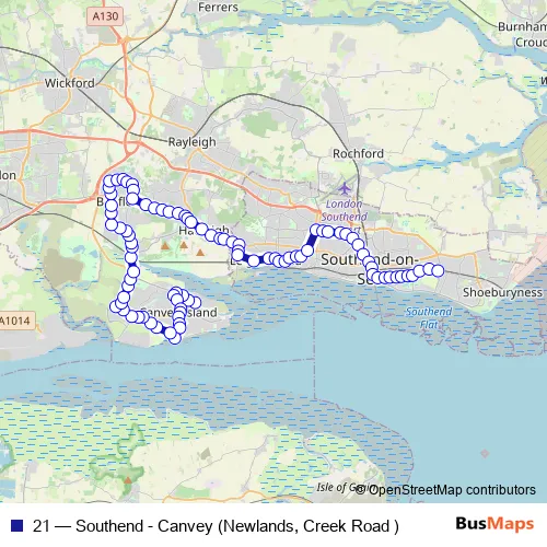 Dovervelt Road - Central Wall Road - High Street - Foksville Road - Furtherwick Road - Western Esplanade - Thorney Bay Road - Long Road - Canvey Road - Charfleets Service Road - Northwick Road - Canvey Road - Ferry Road - High Road - Rushbottom Lane - Arundel Road - Seamore Avenue - Eversley Road - Manor Road - Church Road - Kents Hill Road North - London Road - Kiln Road - London Road - Thames Drive - Belton Way West - Rectory Grove - Broadway - Leigh Road - London Road - Kenilworth Gardens - Prittlewell Chase - Fairfax Drive - Victoria Avenue - Queensway - Chichester Road - Chancellor Road - Queensway - Woodgrange Drive
