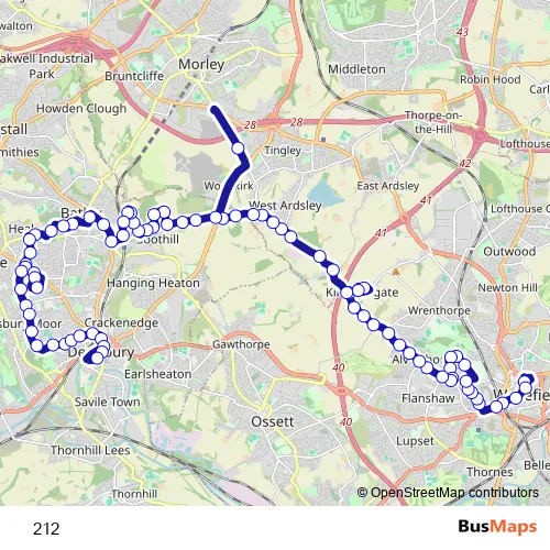 The first stop of the 212 bus route is Wakefield Bus Station and the last stop is Dewsbury Bus Station. 212 is operational during everyday.