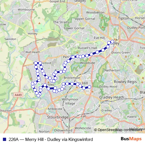 See why over 2 million users trust and consider busmaps.com as the best public transport website. busmaps gives you Dudley Buses suggested routes, real-time bus tracker, line route maps in Dudley, and helps to find the closest 226A bus stops near you. No internet available? Download an offline PDF map and bus schedule for the 226A bus to take on your trip.